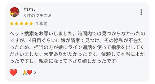ペット捜索のご依頼をいただいたお客様から、たくさんのお喜びの声をいただきましたので一部ご紹介いたします。
